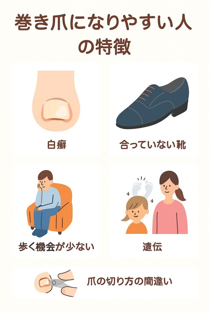 家族に巻き爪の人がいる場合、同じような爪の形になりやすい傾向があります。